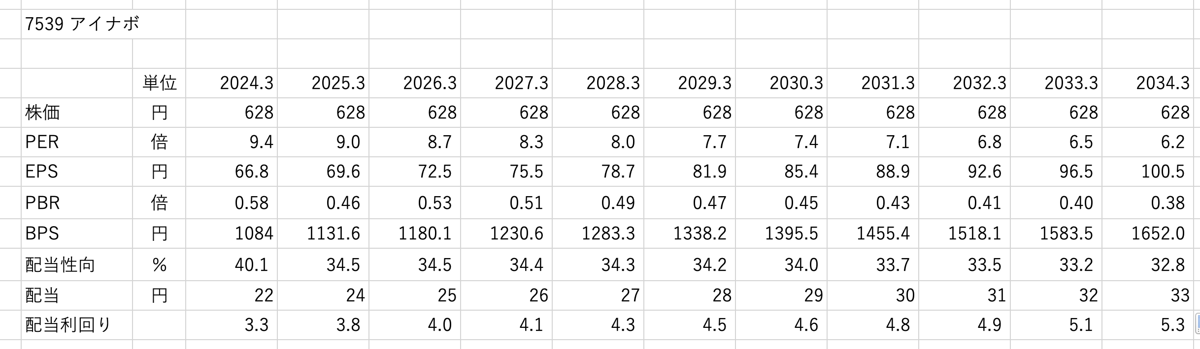 株価変わらず、年に4%成長して、配当1円づつ増やすと仮定する